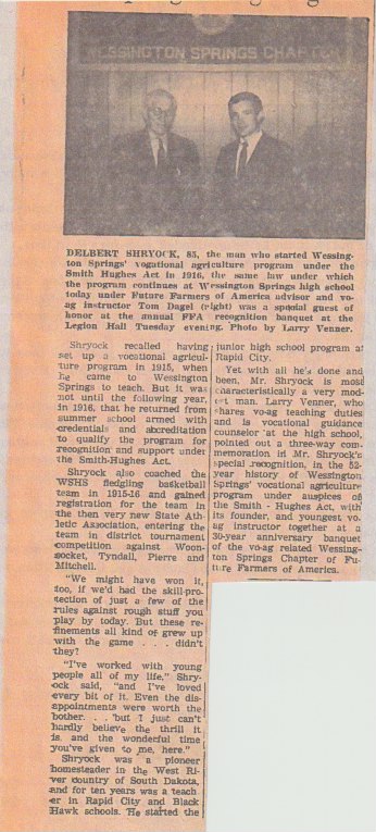 Richard Howard started teaching Vocational Agriculture at Doland High School in 1966. Mr. Howard described his curriculum as the traditional Crop Production, Freshman year; Livestock Production, sophomore year; Agricultural Mechanics, junior year and Farm Management, senior year. This particular curriculum design was considered somewhat standard at that time. The instructional pattern included Monday, Wednesday and Friday classes in the vocational agriculture classroom with Tuesdays and Thursday classes delivered in the shop.